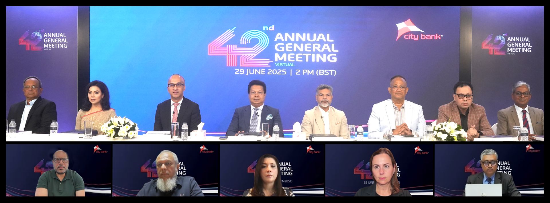 সিটি ব্যাংকের ৪২তম বার্ষিক সাধারণ সভা আজ রোববার (২৯ জুন) ভার্চুয়াল প্ল্যাটফর্মের মাধ্যমে অনুষ্ঠিত হয়। এতে সভাপতিত্ব করেন ব্যাংকের চেয়ারম্যান আজিজ আল কায়সার।
