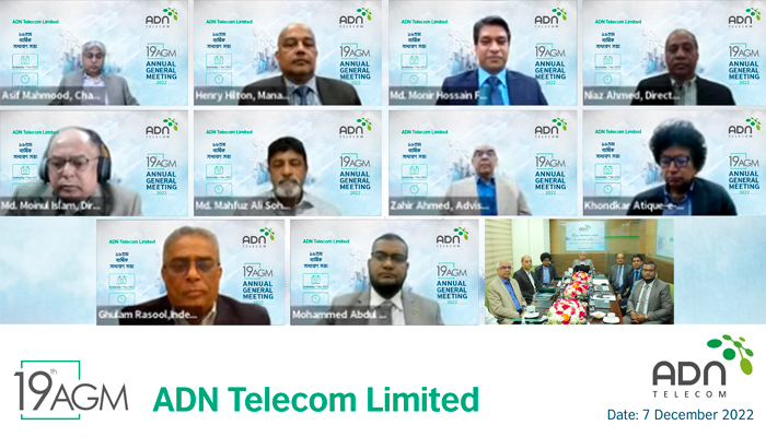 তথ্য-প্রযুক্তি ও টেলিযোগাযোগ খাতে দেশের অন্যতম শীর্ষস্থানীয় প্রতিষ্ঠান এডিএন টেলিকম লিমিটেড (ADN Telecom Ltd.)- এর ১৯তম এজিএম বুধবার, ৭ই ডিসেম্বর ২০২২ ডিজিটাল প্লাটফর্মে অনুষ্ঠিত হয়।