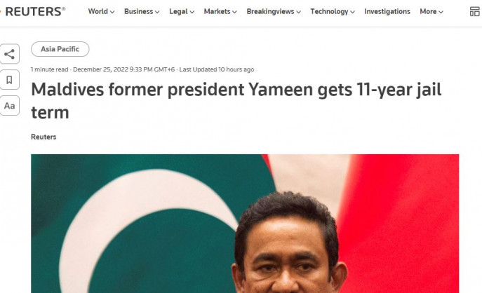 দুর্নীতি ও অর্থ পাচার মামলায় মালদ্বীপের সাবেক প্রেসিডেন্ট আবদুল্লা ইয়ামিনকে ১১ বছরের কারাদণ্ড দিয়েছেন দেশটির একটি আদালত। এছাড়া তাঁকে ৫০ লাখ মার্কিন ডলার জরিমানাও করা হয়েছে।